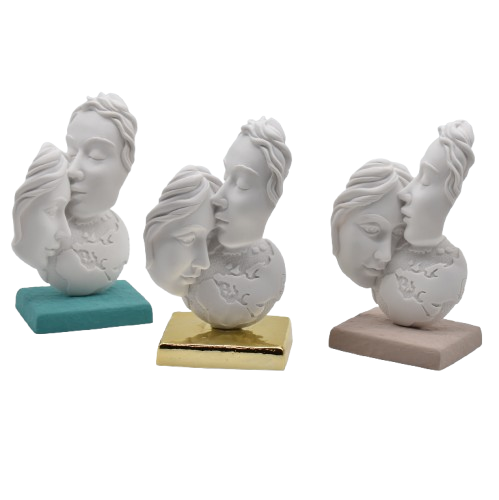 Bomboniera matrimonio coppia sposi in pietra leccese con volti uomo e donna sul mondo su base colorata tortora ottanio eย oro.