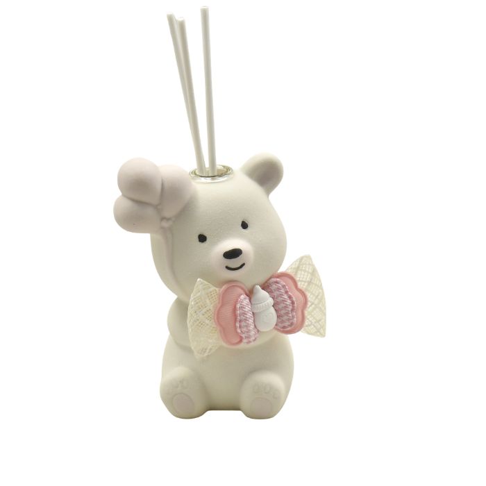 Bomboniera profumatore in ceramica bianca opaca con dettagli rosa, con palloncini rosa.