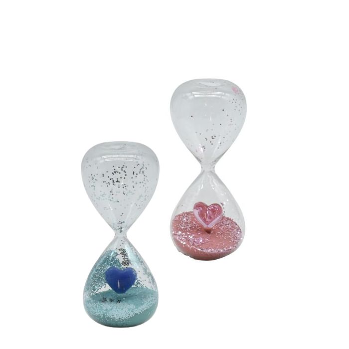 Bomboniera Claraluna battesimo comunione clessidra rosa e azzurra con cuore, visionabile presso il punto vendita Lighting Ideas a Sorbara(Mo).
