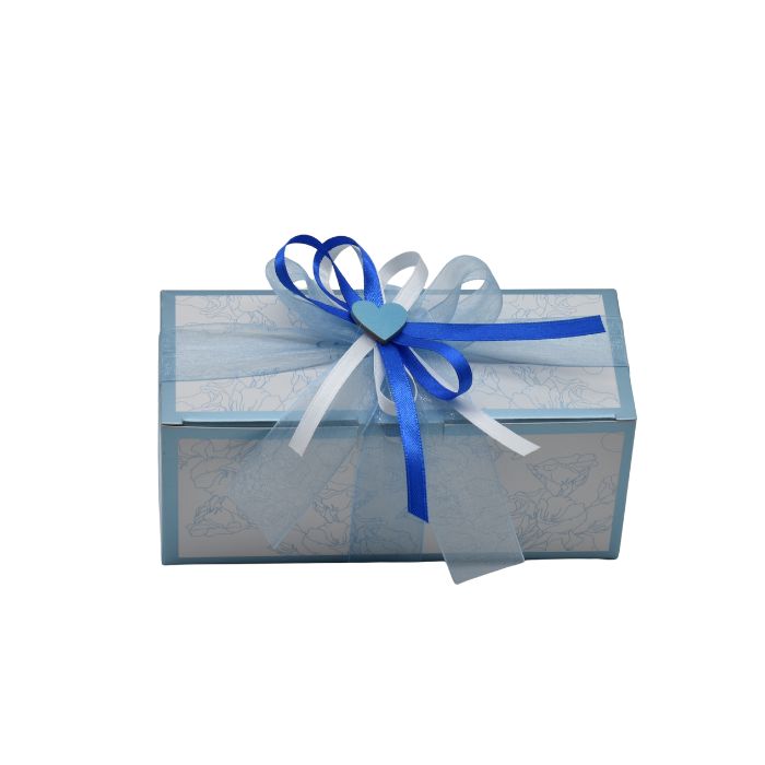 • bomboniera confezionata completa di astuccio, sacchetto porta confetti a scelta, 5 confetti, nastri per la confezione il tutto giร  pronto per consegnarla ai vostri invitati.