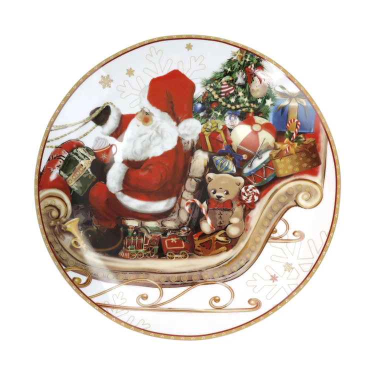 Piatto Nataleย in porcellana portadolci new bone china tondo, con babbo natale in slitta carica di regali.
