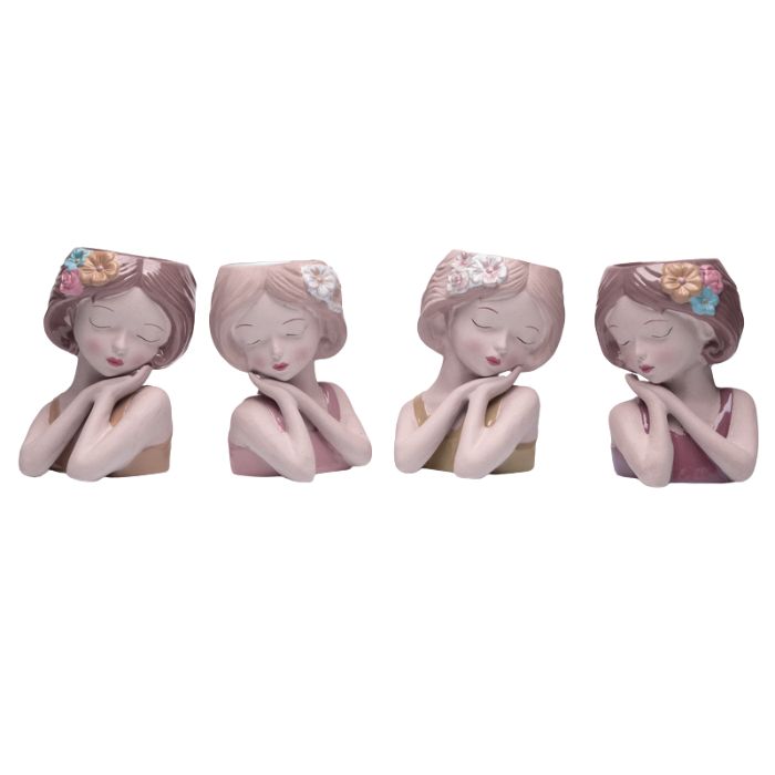 Vaso originale in ceramica opaca colorata con particolaritร ย fiori in testa nei capelli con visi molto dolci. Assortiti in 4 modelli ( senza possibilitร di scelta).