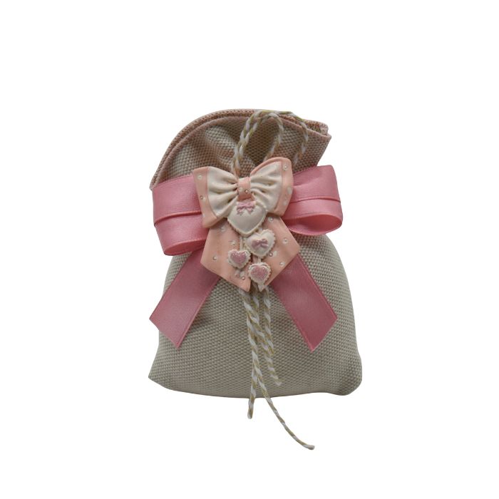 Dimensioni sacchetto alto cmย  12 largo cm 8,5, dimensioni fiocco rosa in resina alto cm 5 largo cm3,8.