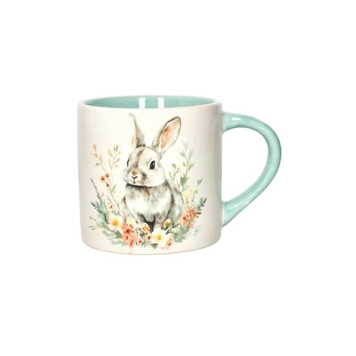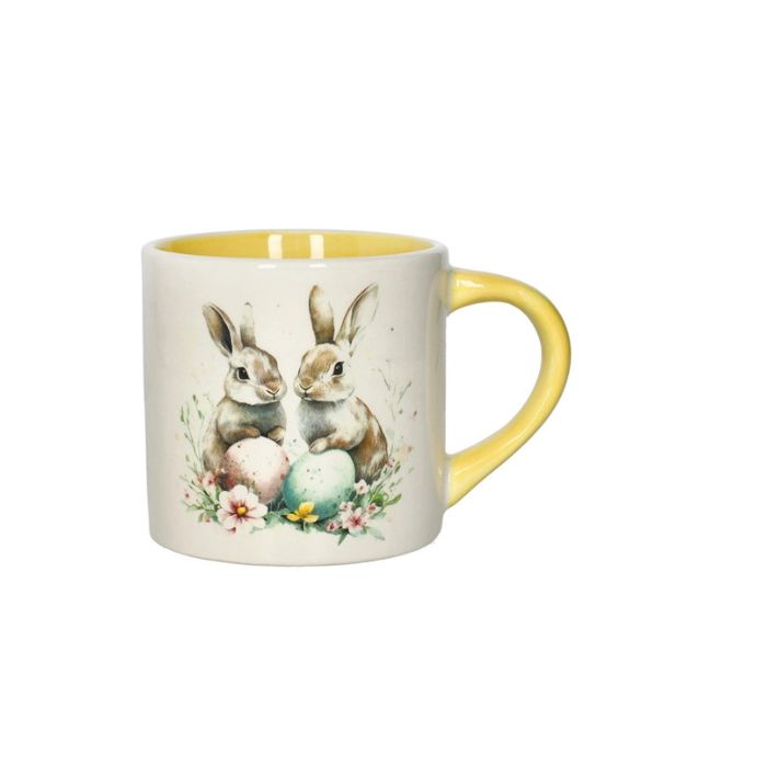 Tazza mug con coniglietti Brandani. Assortite in due colori con interno giallo e interno tiffany , mentre all’esterno decoro con un coniglietto oppure due coniglietti.