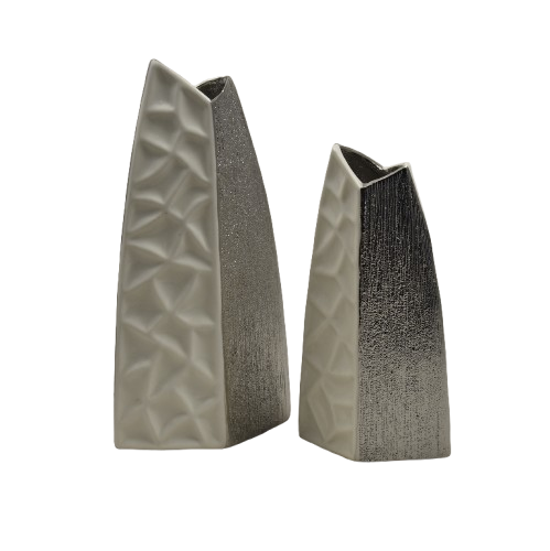 Vaso bianco e argento, la parte bianca รจ in ceramica lucida in rilievo, mentre la parte argento รจ rigata sempre lucida. Forma geometrica, design moderno.